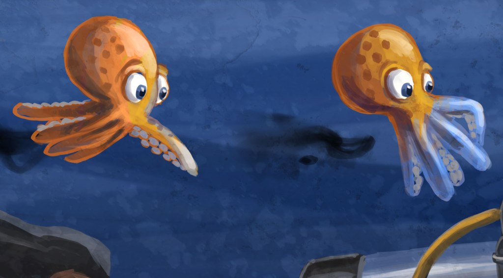 My painting now has atmosphere and some organic grit to it – suspended particles in the water, or a canvas I didn’t actually paint it on, just character like I wanted. And I did that with photos that I took a few hundred yards away from the place where I saw the most amazing thing I’ve ever seen, 20 feet underwater, the first time I was ever in the ocean at night. A book about an octopus in Cozumel is flavored by photos that I took in Cozumel. Not only do the images work and look like I want, but there’s a lovely sense of completion in being able to tie the real-life setting to the fanciful illustration in my story. Here’s a close-up to see the texture overlays in action: